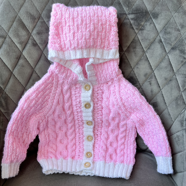 Hand knitted hooded cardigan with detailed cable design, available in a variety of colours.