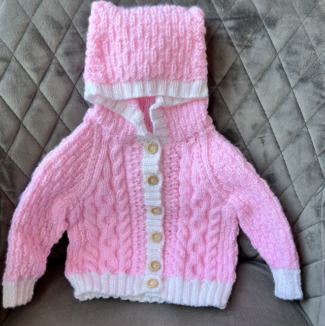 Hand knitted hood cardigan with cable design available in a variety of colours.