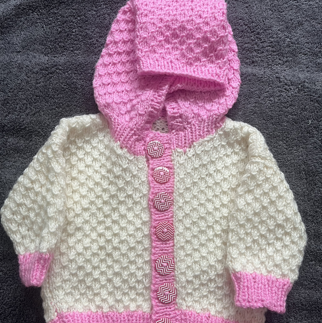 Handknitted Cream and pink scale design hooded cardigan 3-6month