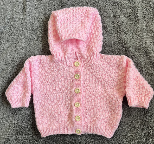 Knit to order Hand knitted hooded cardigan available in a variety of colours. Scale stitch design.